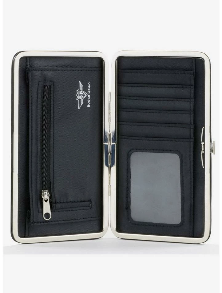 Stylish and sleek, this hinged wallet is made from vegan leather and stainless steel. It features 2 billfolds, 4 card slots, and a windowed ID holder.