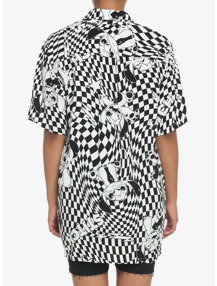 Keep your wardrobe as fun and chaotic as your favorite extraterrestrial! Stitch is here to add something trippy to your look with this woven top. This oversized, boxy button-up features a warped checkerboard print in black & white, with Stitch tossed into the design. Perfect as a light outer layer for those breezy Hawai’i evenings!