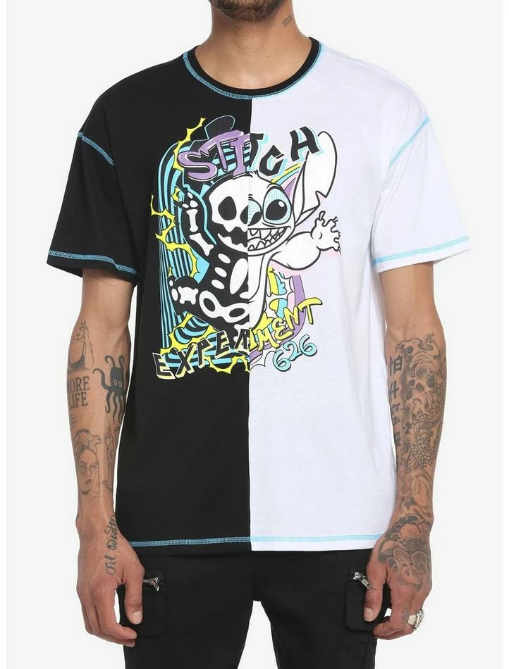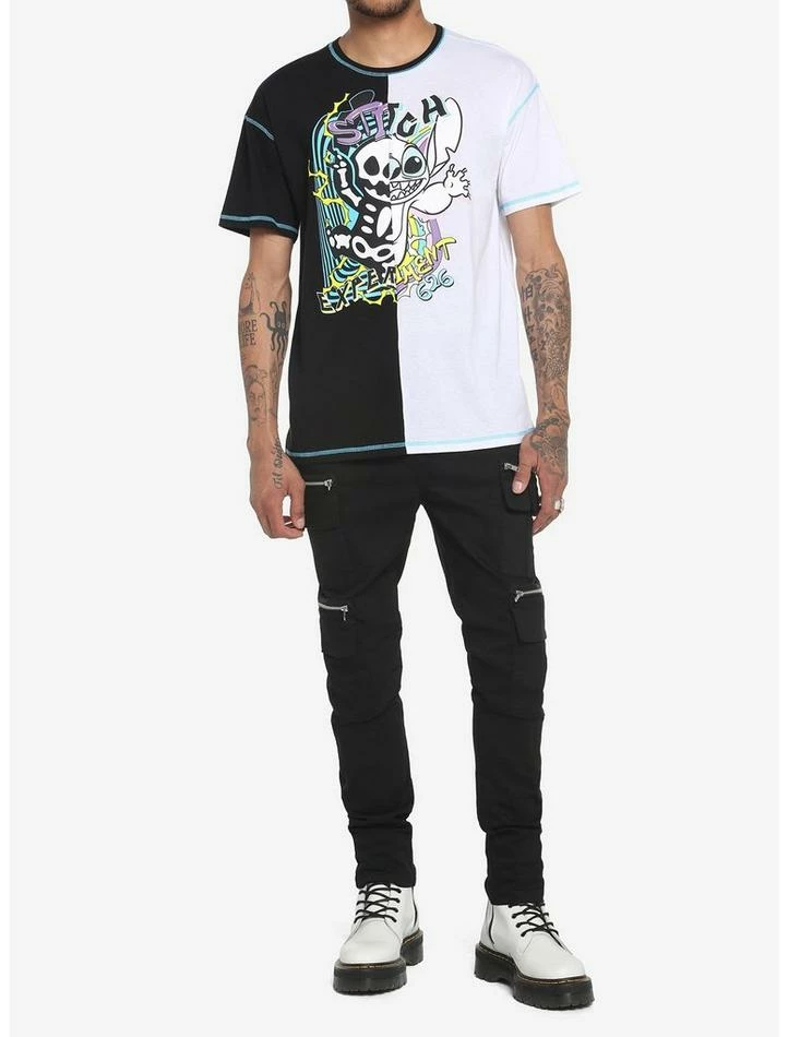 Keep your wardrobe as wild as your favorite extraterrestrial with this tee! Stitch is stepping out of the tranquil shores of Hawai’i to give your look a fresh and trippy streetwear aesthetic. He’s featured in a split design as a skeleton on the black half and a psychedelic print on the white half. “Stitch” and “Experiment 626” are printed above and below him, also in a split design with graffiti-inspired font. Comes with electric blue contrast stitching.